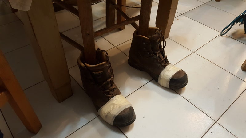 Bei älteren Schuhen löst sich oft die Sohle oder zerbröselt sie noch am Schuh. Der Grund ist meistens die Lagerung im Winter an einem (zu) feuchten/trockenen Platz. Bei den besonderen Beanspruchungen auf Kreta – Hitze und scharfkantige Steine – ist die Sohle schnell dahin!